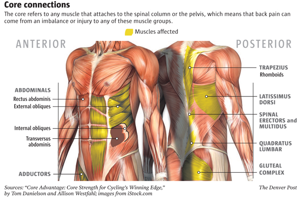 The major muscles included in core strength are: the pelvic floor muscles, transversus abdominis, multifidus, internal and external obliques, rectus abdominis, erector spinae (sacrospinalis) especially the longissimus thoracis, and the diaphragm (used for breathing). Minor core muscles include the latissimus dorsi, gluteus maximus, and trapezius.